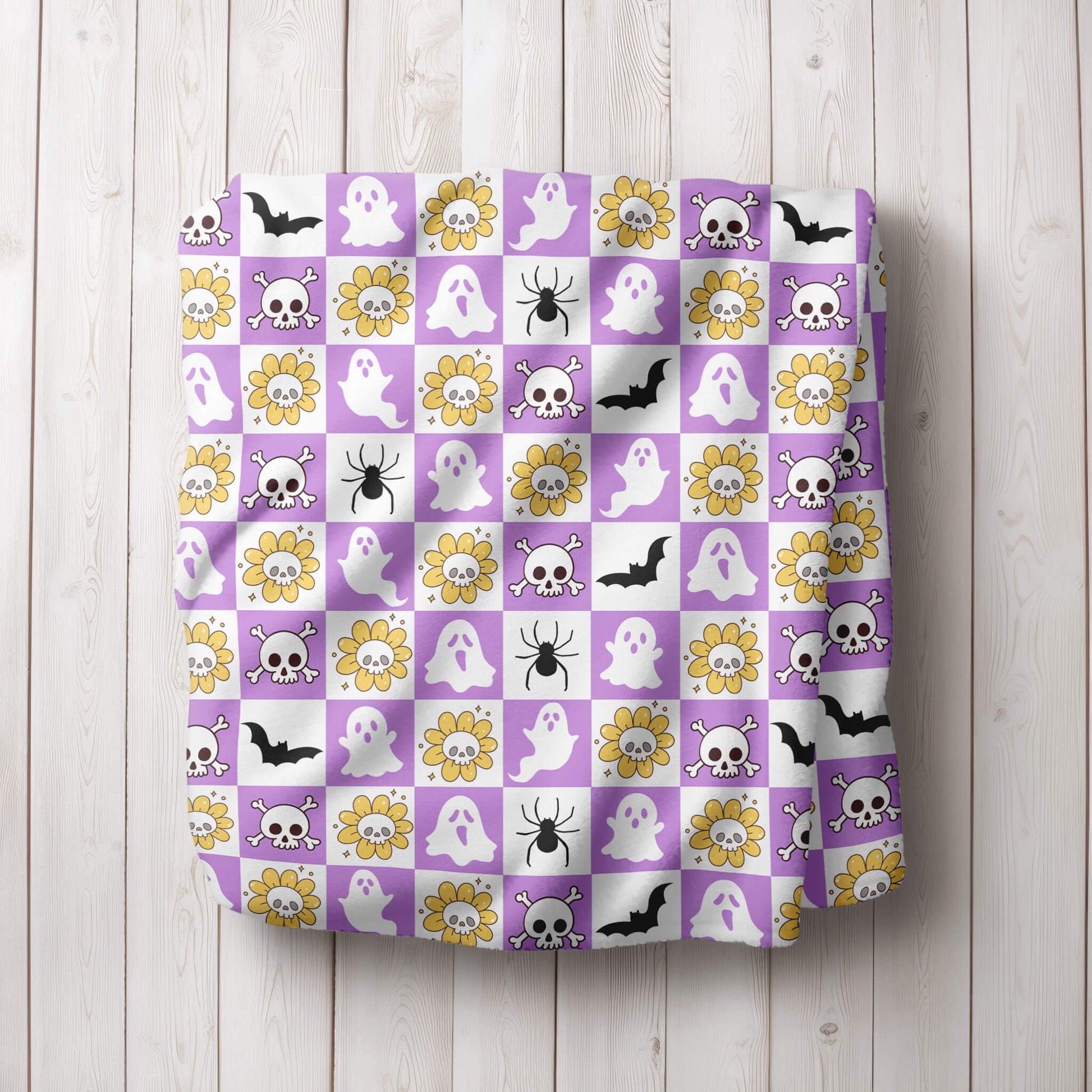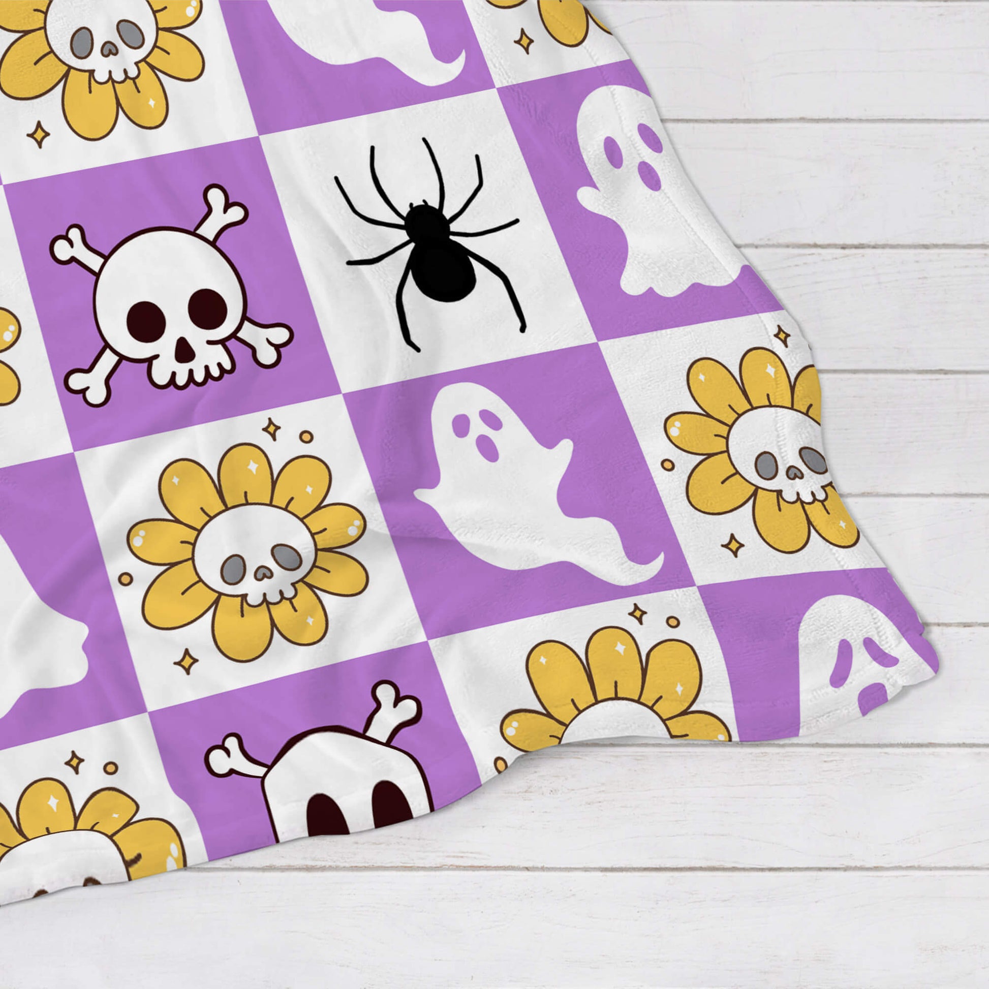 Get ready for a spookily awesome Halloween with our Creepy Charm Blanket, featuring a whimsical mix of creepy icons like spooky skulls, spiders, and bats. This charming design brings a playful touch to the spooky season, making it the perfect cozy addition to your Halloween celebration.